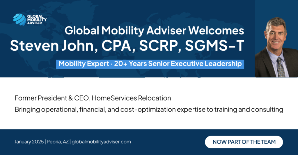 Strengthening Practical Training and Consulting with 20-Year Industry Expertise Global Mobility Adviser has announced that Steven John, CPA, SCRP, SGMS-T, has joined the team as Senior Consultant and Course Curator. A 20-year veteran of corporate relocation and past chairman of the WERC CRP Certification Review Board, Steven brings deep operational and financial experience to GMA’s education and client work. His role focuses on building clear, exam-ready training and translating complex mobility systems into actionable guidance for HR, real estate, and mobility professionals.