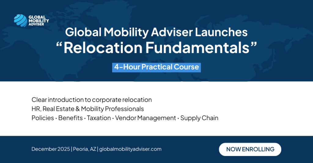 A Practical Course for HR, Real Estate, and Mobility Professionals Global Mobility Adviser has announced the launch of its new course, Relocation Fundamentals, designed to provide a clear and practical introduction to the world of corporate relocation. Aimed at HR professionals, real estate partners, and those entering the mobility field, the course delivers four hours of engaging, accessible content that demystifies how relocation programs are designed, administered, and supported.
